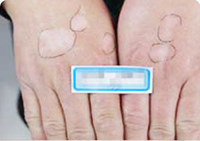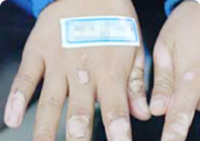 肢端型白癜风 初发于肢端,如面部、手、足指趾等,少数躯体上有白斑。